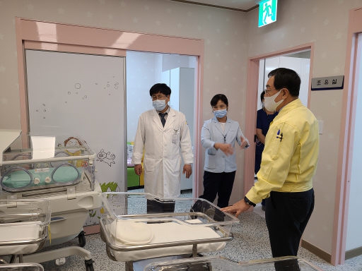 속초의료원 분만산부인과가 5일부터 진료를 개시한 가운데 김철수 속초시장(오른쪽)이 의료원을 방문, 시설을 둘러보고 김진백 원장과 공공산후조리원 개설 등을 협의하고 있다.