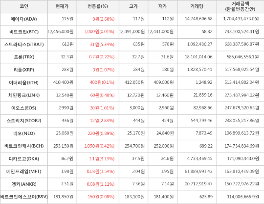 비트코인, 에이다, 스트라티스, 트론, 리플, 이더리움, 체인링크, 이오스, 스토리지, 네오, 비트코인캐시, 디카르고, 메인프레임, 앵커, 비트코인에스브이현재 암호화폐 거래소 "업비트"에 따르면 가상화폐 대장 격인 비트코인의 시세는 전일 대비 1,000원(0.01%) 상승한 12,456,000원에 거래되고 있다.