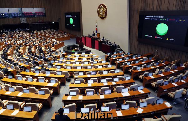지난 7월 30일 오후 열린 국회 본회의에서 미래통합당 의원들이 집단 퇴장한 가운데 주택임대차보호법 일부개정법률안이 가결되고 있다. ⓒ데일리안 박항구 기자이처럼 22일로 예정된 본회의를 하루 앞두고도 평행선을 이어가며 합의에 이르지 못 하고 있지만 민주당은 추석 연휴 전 추경 집행을 위해 반드시 이 날짜에 처리해야 한다는 뜻을 굽히지 않고 있다.따라서 합의가 여의치 않을 경우 민주당이 175석의 다수 의석을 바탕으로 단독 처리에 나설 가능성도 배제할 수 없다는 관측이다. 다만 통신비 2만원 지급 방안을 놓고서는 야권 뿐 아니라 범여권으로 분류되는 정의당·열린민주당도 강하게 반대하고 있어 강도 높은 비난을 피하기 힘들 전망이다.