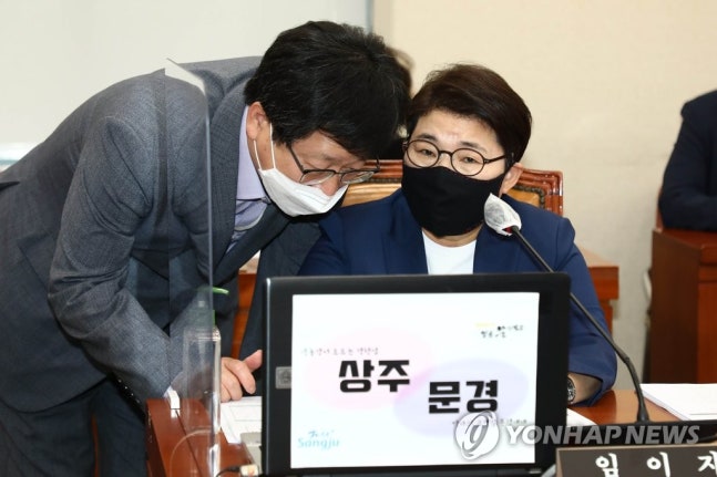 (서울=연합뉴스) 진성철 기자 = 22일 오전 국회에서 열린 환경노동위원회 전체회의에서 임이자 국민의힘 간사(오른쪽)와 안호영 더불어민주당 간사가 대화하고 있다. 2020.9.22