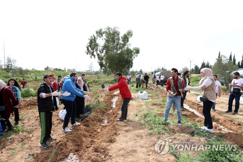 Syrians plant trees in Douma City in the countryside of Damascus, Syria, 05 March 2020. The activity is a part of a campaign launched by the Majd Youth volunteer team under the slogan 'one million love trees for Syria'. The activity would continue till the end of April and cover all Syrian provinces. EPA/YOUSSEF BADAWI